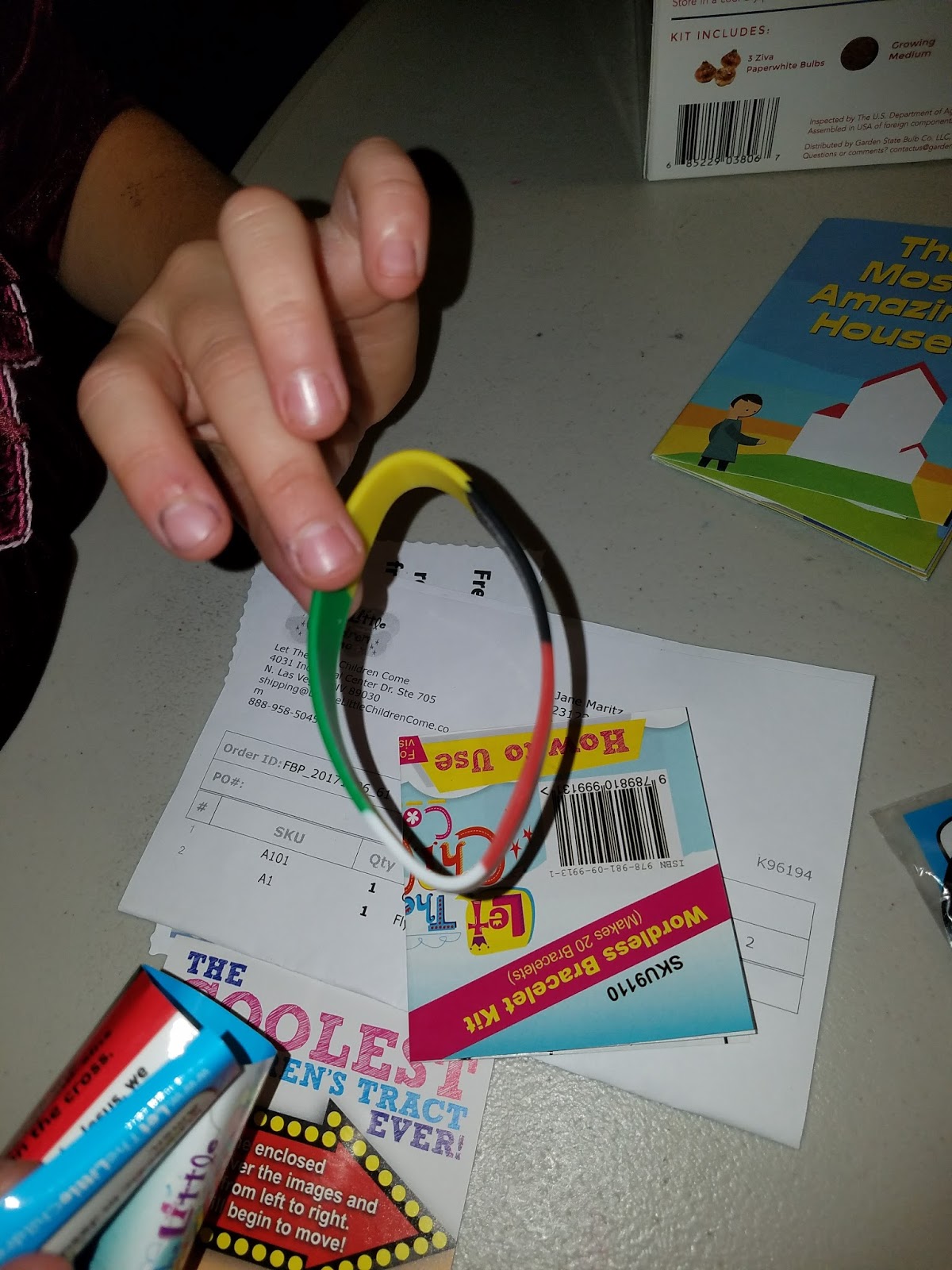 So we wrapped up with prayer (for safety of parents and hippos and other such things) and headed into the kids' favorite part of the program: free time. And I brought out my Let The Little Children Come sample pack and laid the contents on the table to see what their response would be. Would it be enough to distract them from their favorite activity of hurling themselves into the giant brown beanbag?It was. I watched as one would figure out how the FlipAbout or the Animated Tracts worked and share them with another. One 7yo girl was drawn to the salvation bracelets, and I talked through what each color represented with her - a simple and beautiful story of salvation.